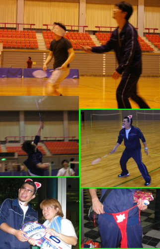 6月6日この日は、水曜日。毎週水曜日と言えば、広島事業部第1グループは、ミーティングの日。 なのですが、この日は、仕事をサクッと終わらして、皆でバトミントン大会を開催。 1チーム2名、全7チームでの対戦。何故か主任だけ一人?(主任は、なにやらしても上手いから)これには主任もブーイング。 しかしメンバーの予想を裏切り、スーパーハンデにもめげず決勝戦まで勝ちあがる主任の底力。 (主任のあだ名は、ブラックデビル。関係ないけどね・・。) でも、流石に決勝では、悪魔でなく、主任もお疲れの様子。徐々に体力を奪われていく姿を、対戦相手は見逃さず、ここぞと言わんばかりに、渾身の力を込めて、スマッシュの雨あられ。 「主任敗れる」と、社内に号外が出たかどうかは知らないが・・。若くないのに無理がたたり、数日お熱が・・・。 ちなみに優勝チームには、賞品が用意されていましたが、「赤いスケスケのヒモパン」。 まっ、まったくバトミントンには関係ない商品を、フューチャーした主任の趣味は凄い。 このグループしばらく安泰と見て良いでしょうね。