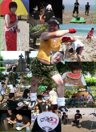 8月25・26日、広島事業部 第1グループ は『ケニーズブートキャンプin恋が浜』 を開催した。『ケニー』とは同グループ責 任者でもある、益村主任の社内愛称。 1泊2日とはいえ、実行委員の計画と準備 は万全完璧、内容盛り沢山の2日間。 テント設営、BBQ準備に始まり、オリジナ ルうちわ作り、それを使って二人三脚ビー チうちわ?大会、転がしドッチボール。 夜は大バーベキューディナ〜。 食後はもちろん大花火大会。 朝は全員でタイトルの『ケニーブートキャ ンプ』を実施、朝食を終えると、遊び三昧 タオルで海水運びゲームに、リンボーダン ス大会、お約束スイカ割りも抜かり無し! また仮装をする者あり、裸になる者ありで 見ていてもメチャメチャ楽しそう。 もちろん当事者達は想像を超えた楽しさ を味わい、大満足の時間だったようです。
