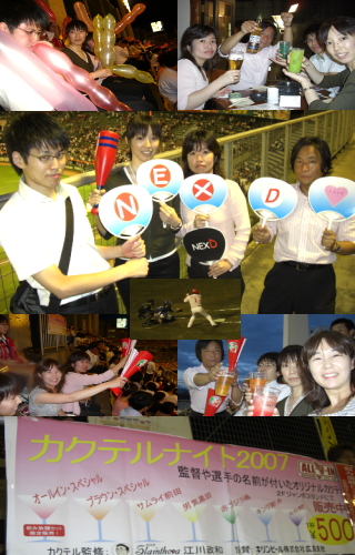 07年8月31日(金)広島東洋カープ前田智徳 選手通算2000本安打まで後3本!しかも市 民球場はカクテルナイト2007イベント。 年間5試合のみの限定で、カープ選手名の 付いたカクテルが飲み放題! これは行くしか無いッ!て事で第2グルー プメンバーは業務終了後、広島市民球場へ GO!残暑はまだ厳し〜〜ッ!て事で、何 とNEXDオリジナルのうちわを自ら作 成、持参した凝り性のメンバー達。 カープ応援グッズも忘れてはません。 しかし・・・全力の応援も実らず・・・ヒット2本で1999本。う〜ん・・・中途半端。 ゲーム終了後は近所の居酒屋で野球談義に花を咲かせた御一行様でした。