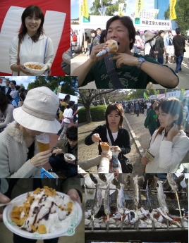 10月27日(土)広島事業部第2グループグルメ隊 は、広島城公園で年1回開催される県内最大食の祭 典『フードフェスティバル2007』に参加。 ひたすら歩いて屋台を見て廻る、そしてお気に入り のモノをひたすら食べまくる脚力と胃袋勝負のイ ベント。彼らはグループ参加の利を生かして、一品 でも多くの料理を味見する為、一人前を少しずつ分 け合って食べると言う知恵を使ったのでした。 当日は残暑?晴天で、もちろんビールもゴクゴク。 こちらは分け合いません。幾らでも入ります。 最後には全員で護国神社に参拝、その後RCC(地元 TV局)を見学、マギー真司、TIMにも遭えました。