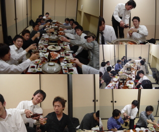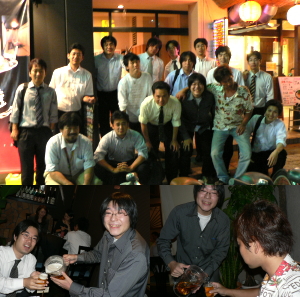 10月5日(金)東海事業部では、第5グループに新 たに配属が決定した噂の新人の歓迎会を開催した。 新人君は第5グループメンバーとは高専の同級生で 親友同士とあって、オープニングからフレンドリー な雰囲気で馴染みまくり。 同一趣味を持つ先輩とは早速熱く語り合う姿も。 しかし、そこはルーキー、新人義務は忘れません。 挨拶の後は早速先輩達へのお酌廻りを開始、ゆっく りと食べるヒマも無かった様子。 が、お酌中も目線はバッチリ!カメラ目線、その辺 り抜かりはなし。さすがです。 東海事業部歓迎会と言えば、一にお酒、二にトーク で戸惑う新人も多い中、この新人君の場合は、逆に 「待ってました!」状態。将来が楽しみですです。