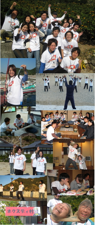ネクスディ恒例行事の新人&内定者合宿が今年も11月3・4日、呉市蒲刈下島のコテージを借り切って実施された。 今年は14名が参加の大所帯。 内定者達は既に何度か会社イベントや先輩交流会等に参加済みで、お互い顔馴染みでオープニングから和気あいあい。天候も温暖化の影響?この時期としてはポカポカ陽気で環境は最高な状態の中、毎年恒例、内定者による選手宣誓で合宿はスタートした。 まずは蒲刈名産『藻塩作り体験』その後、昨年は恐怖の坊主となった魚釣体験。 もちろん、NEXD式個人バトルで賞品争奪戦、今年は天候の影響からか良い型のサバが爆釣!ただ一人を除いて・・・。 夕食準備は新人達の大きな仕事、もちろんご飯も、お釜で火おこしから着手。戸惑う新人達・・・。 上手く炊けるのか?不安一杯・・・やはり大量のオコゲ発生。 食事の後はいよいよ合宿メインイベント、ネクスディゲームで入社から1年間を擬似体験するゲーム。 もちろん豪華賞品が懸かっています。 こちらには罰ゲームも・・・全員必死です。 翌日は早朝ラジオ体操、海岸マラソンからスタート、やはり11月、朝6:00はさすがに寒い。 続いて将来の夢を海から昇る朝日に向け絶叫〜タイム。 みんなデカイ夢、持ってます。 朝食後、合宿最終メニュー『みかん狩り重量コンテスト』これはチームに与えられた課題重量のみかんを採って課題重量に最も近いチームが優勝、最も開きが大きいチームは罰ゲームが待っている天国と地獄が隣合わせのゲーム。 結局、罰ゲームは役職者チーム!ストッキング被りの刑で合宿のフィナーレを迎えたのでした。