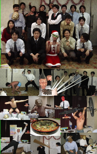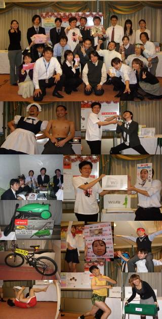12月21日(金)東海事業部今年最後のBIGイベント!恒例大忘年会が刈谷プラザホテルで開催され、今年も大谷社長以下、役員全員が広島より駆け付けた。 男性中心の東海事業部、また今年最後とあって従業員達はオープニングから飛ばす、飛ばす・・・。 ひとことで言って『お下品』に尽きる(涙) 改めて本ページで紹介、しかし・・・使える画像が余りに少ない!少なすぎる! 広島事業部に続き、コンセプトは基本『脱ぐ?』としか思えない乱れ振り!変態的SMショーあり、キモイコスプレあり、巨大ハリセン登場に黄金の大仏、ストッキング被り変態的ポーズ・・・。 今年も大抽選会は豪華賞品がズラリ。ランボルギーニ社製MTB、DVDプレーヤー、PSP3、Wii&WiiFit、デジカメにハンディ掃除機、広島清酒、モミダッシュ、フェイスバンクetc しかし、当選が決まると次々脱ぎ出す従業員達。 さすがに社長も頭を抱え込む場面も・・・。 東海忘年会では今年の新人賞表彰が行なわれ、今年も『夢の現金掴み取り』を開催、またフォト銭(ジェニ)ック大賞の発表の他、今年最も健康診断結果が良かったとして『ベストヘルスKING』の表彰も行なわれた・・・が画像出せません(涙) 料理もホテルだけあってさすが上品、しかしテーブルに登場、即完食!で食うもサバイバル状態。 今年も乱れに乱れた東海忘年会でした。