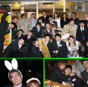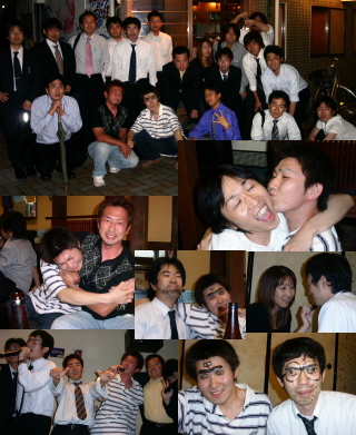 6月1日に、配属先グループメンバーからは、一足早く歓迎された新人くんですが、まだ19歳。実はネクスディ最年少なのです。 そして、この日は、いよいよ事業部挙げての歓迎会!ツワモノ達?キャラ濃いメンバー達?と、つっ遂にご対面! そんなに緊張しなくても、お兄さん、お姉さんたちが、可愛がってあげるからね〜〜。(ゴクッ) (まだ青年には、ちと荷が重いか・・・) 「ヨロシクッス」と、先輩達にお酌しながら回る初々しさ。しかし、容赦なく、先輩達の力強い激励(←写真の通り)に、新人君はクチャクチャに・・・。 この激しさ、まるで何処かの国の「成人の儀式」見たいです。そして2次会では、全員総立ちでカラオケ熱唱!新人君、すっかり溶け込んでいましたよ。 【伝 言】 少し営業ノリなメンバーが多いですが、こんなノリが大好きな、女性社員を、ぼっ、募集してま〜す。 だそうです。