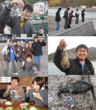 12月1日(土)営業部長が最近ハマリまくって いる『イカ釣り』にみんなで行こう!と部長が 社内掲示板で呼び掛け、6名の隊員が集まった。 以前の『サメ狩隊』同様に、初心者ばかり。 という事で、部長以外のメンバーは途中釣具屋 でイカ用ロッド&リール、エギ(擬似餌)を購 入と、マジ素人ばかりの不安一杯のスタート。 釣り始め、1時間まず部長の竿にあおりイカやや小型がヒット!俄然盛上るメンバー達。 が、午前中はその1杯のみ。昼食を島の食堂でワイワイガヤガヤ楽しんで午後の部スタート。 またもや部長の竿に結構良いサイズのイカが再びヒット!微妙な空気が流れ始める・・・。 夕方、部長以外は全員戦意喪失状態でボウズ。 「帰ろうか」と投げっ放しの糸を巻き上げているとき奇跡が起こる!メンバーの一人のエギにしっかり抱きついた小型のあおりイカの姿!一気に盛上るも、戦意は回復せず納竿。 サメに続き、以イカにもリベンジを誓うイカ釣り隊メンバー達でした。(涙)