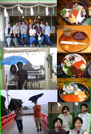 7月14日(土)東海事業部第3グループのメンバーは同グループメンバーの結婚記念祈願&旨いもの食べよう!と伊勢神宮へGO! しかし・・・大型台風接近中でコンディション最悪、しかし、おめでたい事でもあるし、思い立ったが吉日ッて言うし、やっぱりGO! さすがです。恐るべし第3グループ。 とりあえず参拝を済ませて、夫婦岩をバックに画像をGet!実はメンバー全員の真の目的、ご当地グルメタイムに即効突入。 伊勢と言えば、エビ。アワビやウニ、イクラにマグロ、車エビ、もちろん伊勢エビ丸ごとド〜ン!と乗っかった超豪華贅沢丼4,500円也、サザエもイカも丸焼きで満腹満足。 三重と言えばデザート『赤福』も当然胃袋へ。 天候は最悪、しかし満足度は台風より大きかったとか。もちろん祝福された2人も大感激。