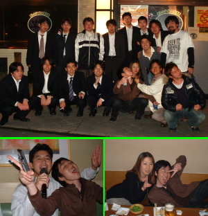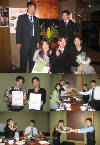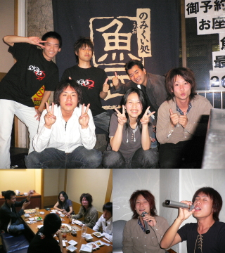 9月29日(土)広島の第10期(07年4月学卒入 社組)の3名は、来年4月入社予定3名の内定者 の入社前の不安、疑問を吹き飛ばすべく、居酒屋 に招き親睦交流会を行なった。 彼らにとって初の後輩達!気合も十分、自らがデ ザインしたネクスディTシャツに身を包み登場。 もちろんお互いに初対面、しかし年齢的に近いと 言う事で、全く違和感なく交流が図れた様子。 時とお酒が進むにつれ、内定者からはモノマネも 披露され、大盛り上がり。 その勢いのまま、カラオケBOXへ突入! 来年入社予定者達は明るく元気一杯。 先輩達の方は若干押され気味…。 しかし、真面目な質問も幾つか飛び出し、半年前 の自分に置き換え、説明とアドバイスを行い、本 来の目的もしっかり果たした先輩達でした。