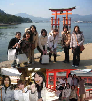 12月8日(土)女の子会が、日本三景のひと つ『宮島』に久々に大集結した。 当日は晴天、12月としてはポカポカ日和。 紅葉の季節は既に終わっているものの、彼女 達には「そんなの関係ねぇ〜?」 宮島と言えば世界文化遺産厳島神社?弘法大 師が灯した消えずの霊火?イエイエ、彼女達 の宮島と言えば『焼きたて熱々もみじ饅頭ゥ 〜』『今が正に旬!殻付焼きカキぃー』『うえ の穴子飯!』・・・そう、グルメの島なのでした。 メンバーの中には宮島初上陸の者も居て、グ ルメに観光、立ち並ぶお土産物屋巡り、そし て何よりのお楽しみは、延々と続くトーク。 彼女達はみな、日々の業務疲れを十分に癒し、 大満足の休日を過ごした様子。