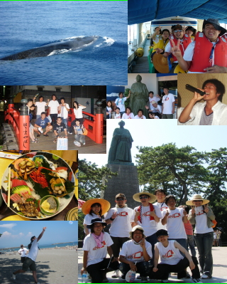 行って来たぜよ〜南国土佐へ。 今回はNEXD有志と来年採用内定者を引き連れて、ホエールウオッチング&土佐満喫の1泊2日の旅!いやぁ〜暑かったぁ〜。 なんつッても、まずは坂本龍馬像前でパチリ、そして〜箸で摘んでCD遠投大会in桂浜。 これ意外と難しいッス。 夜は高知料理満喫大宴会〜。捕れたて新鮮海の幸!カツオのたたきに、豪華な皿鉢料理、四万十の幸…全てがマイウ〜!豪華景品を賭けたゲーム大会はメチャ大盛り上がり、しかし…ここでは絶対に言えない内容に…。 下!シモ!しもぉぉぉ〜の放送禁止系。 翌朝はお待ちかね、ホエールウオッチング! 天気は最高!クジラも見れて超大満足! 船酔い者少々(涙) 充実、濃厚、太陽と笑いの二日間でした〜。